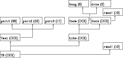 This figure shows a small filesystem. Each box has one of two annotations. A directory is annotated with DIR, and a file is annotated with a number, which signifies the file’s size. The tree’s root directory is TS. It contains one file, read!, and two subdirectories, Text and Libs. The Text subdirectory contains three files; Libs contains two subdirectories, each of which contains at least one file. Altogether, TS contains seven files and consists of five (sub)directories.