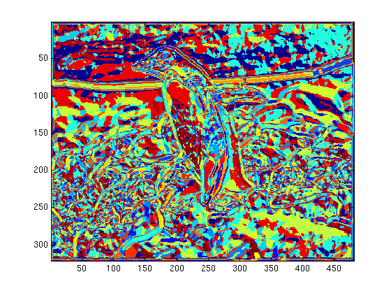 Areas with similar texture should respond similarly when convolved with each filter. For example, an area with many vertical lines will respond strongly to the horizontal derivative filters only, while an area with a spotted texture will have a somewhat average response for all orientations. We convolve the input image with each image in the filter bank to get a filter response vector for each pixel in the image. We then run a k-means algorithm (I used k = 64) to group these filter response vectors into descrete "textons." An example texton map is shown below.
