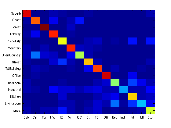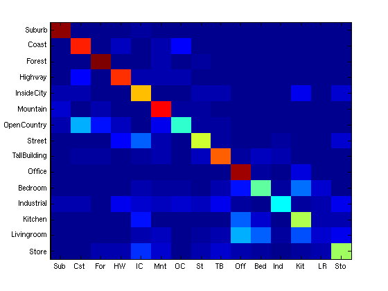 The best results I got were achieved with a larger feature size. Smaller features are the worst for the living room images, which typically have large objects in the foreground and very little small object similarity. With larger feature size I was able to achieve a better than random result for this category.
