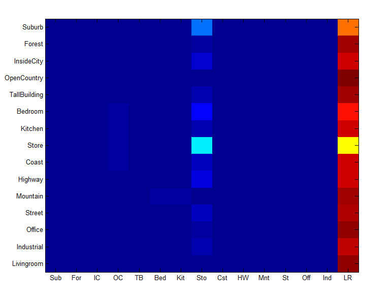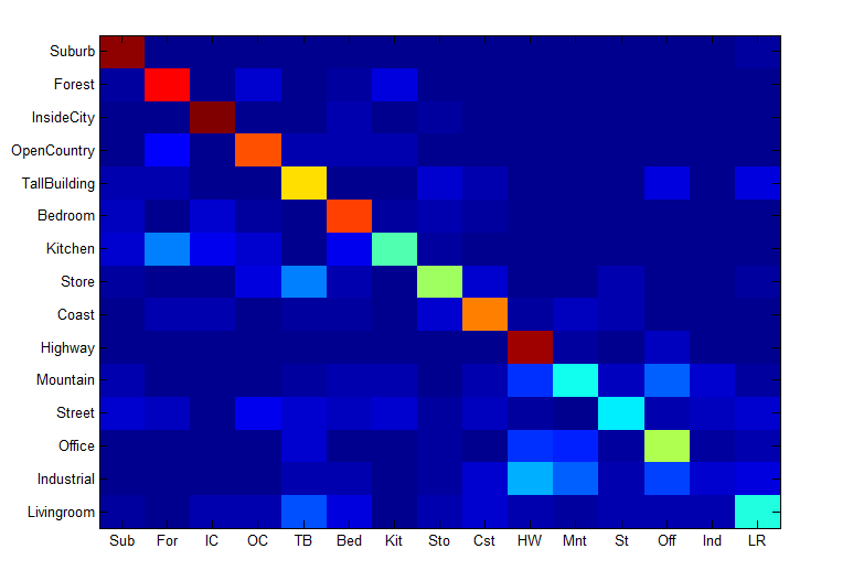 Fig. 1: Visual Illustration of the confusion matrix built after classification with vocab size of 200, fixed test/training set, 1/4th features randomly chosen for clustering. Accuracy of 0.6027