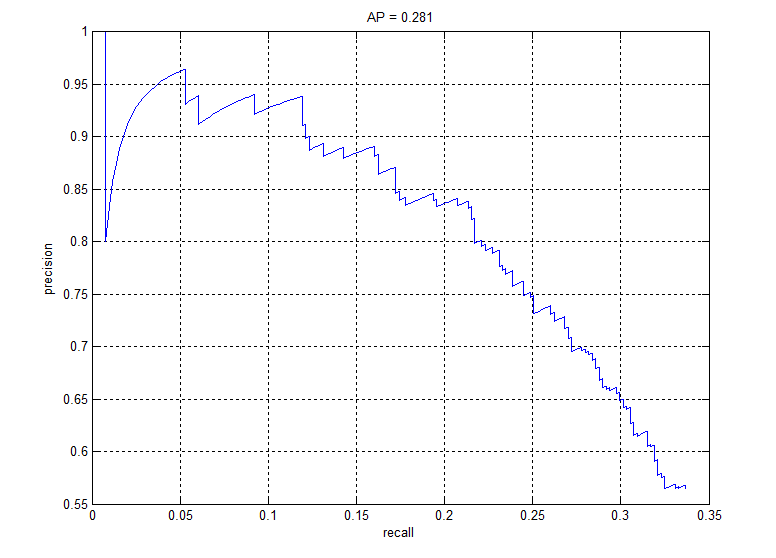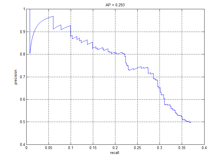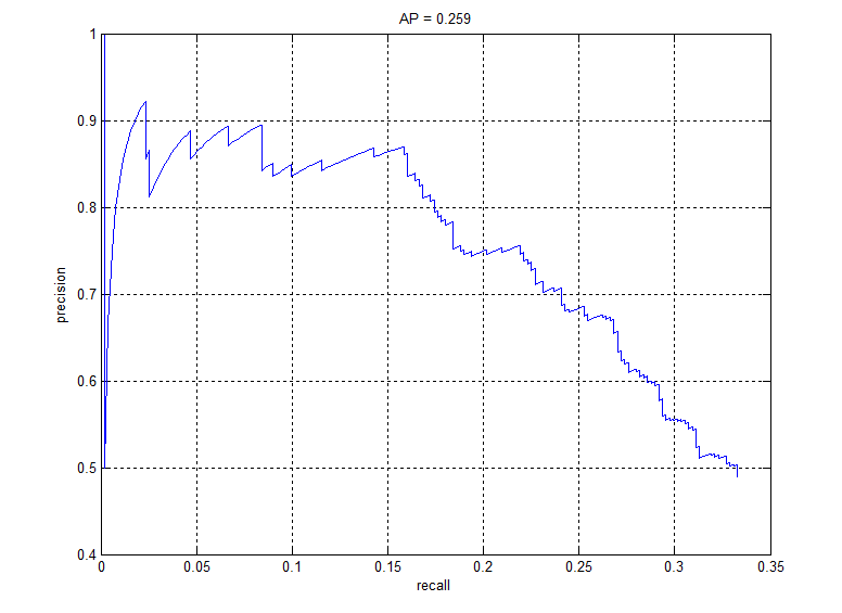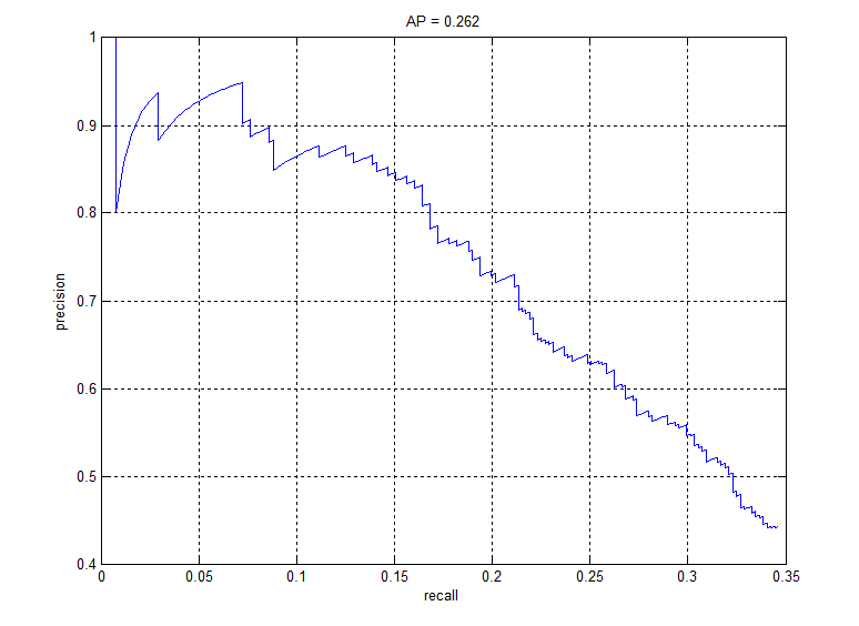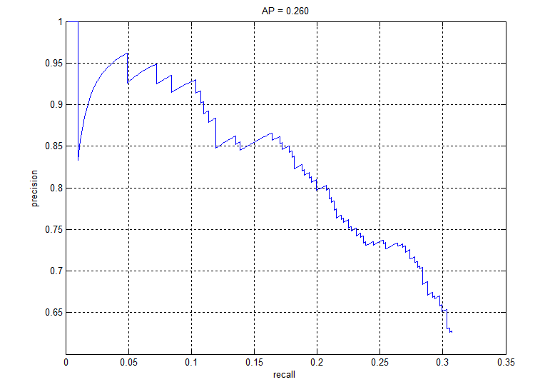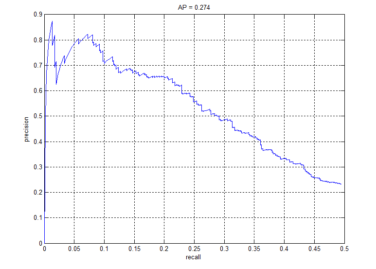 Fig. 9: Precision recall graph for linear SVM classifier ran for one iteration of getting random negatives and one iteration of hard negatives