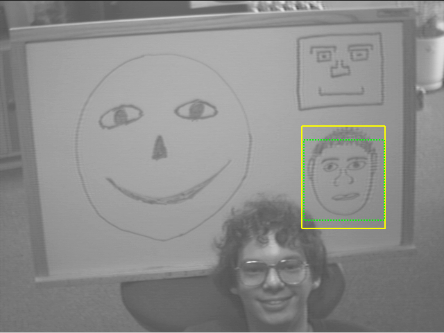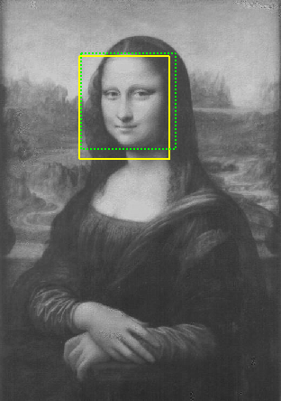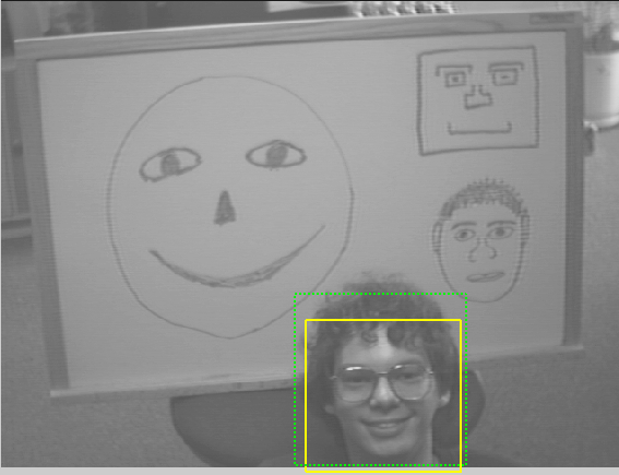 Fig. 1: Two faces successfully detected in the same picture, yellow box denoting ground truth and green box denoting detection