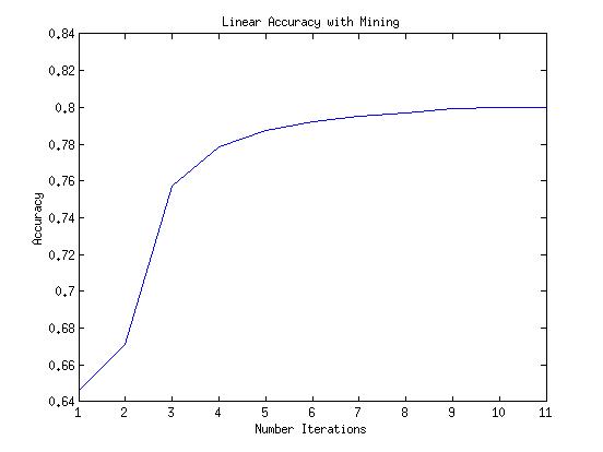 After having done a few tests to find the optimal SVM parameters, I gage the performance of the detector with the linear and nonlinear features with varying amounts of hard negative mining. Below you can see the performance of both the linear and radial kernel as functions of iterations.