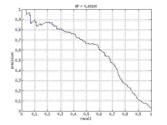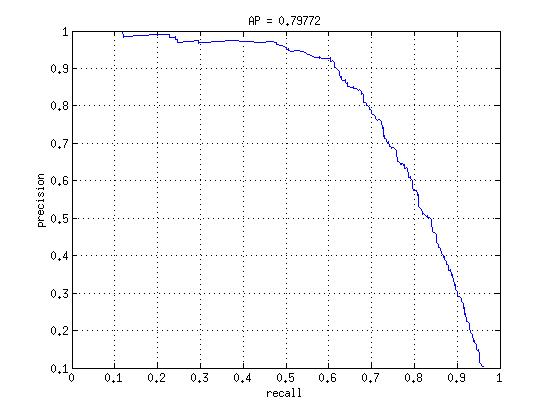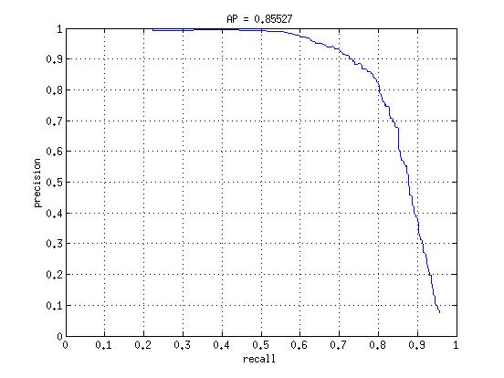 The radial kernel with no hard negatives looks very similar to the linear with hard negatives, except it lacks the perfectly flat line at the star, which makes sense because random negatives can't give it a perfect sense of what a face is at any significant threshold. Once the hard negatives are mined, we see the same phenomenon as we did in linear, where the precision stays almost flat at 1, but for a much larger recall now before finally sloping down again. As expected, this kernel allows us to better classify face data which does not likely fall in a linear region. Chances are that in some high dimensional space it just occupies a region which is surrounded on all sides by nonfaces.