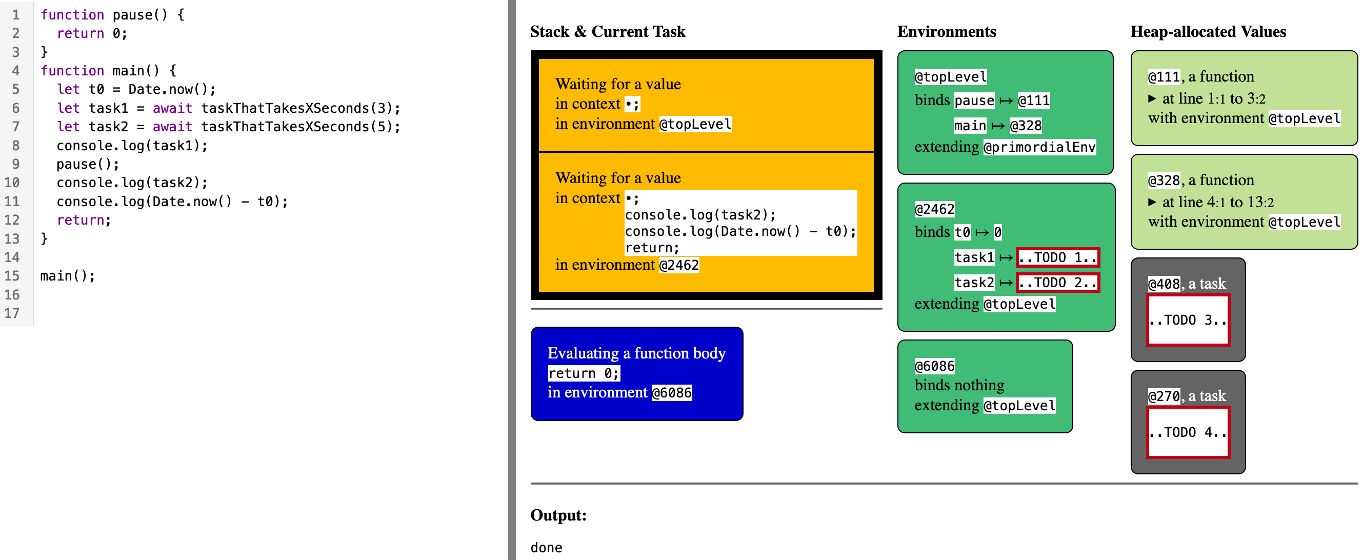 We want you to demonstrate your understanding of async/await by drawing the stack + heap configurations, in the style of the Stacker, for the two JavaScript programs. Below are templates for the stacker at the point of calling pause for each program above. You need to fill in each of the “Todo”s.
