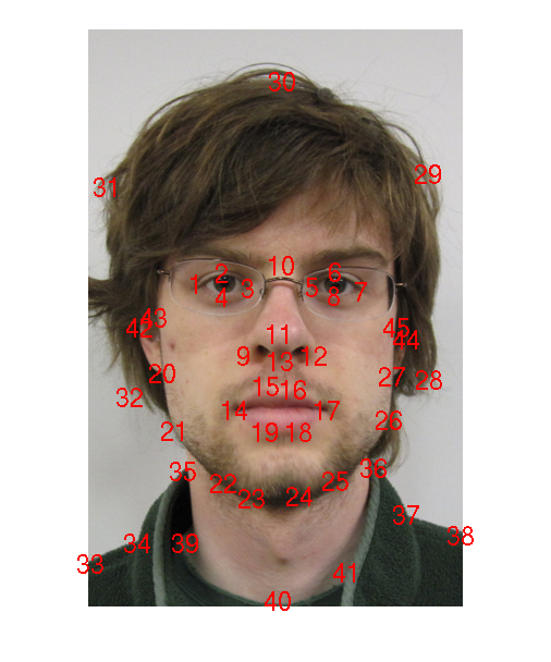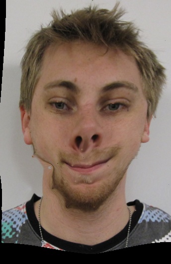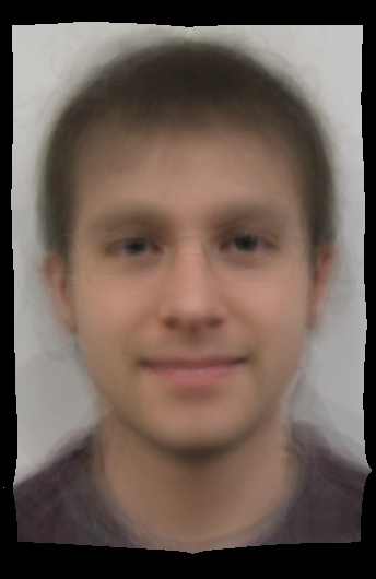 The algorithm can be slightly modified to produce a average face. This is done by averaging the correspondence points and then morphing each face to the average point set. Then each of those morphed images is averaged to produce the above result.