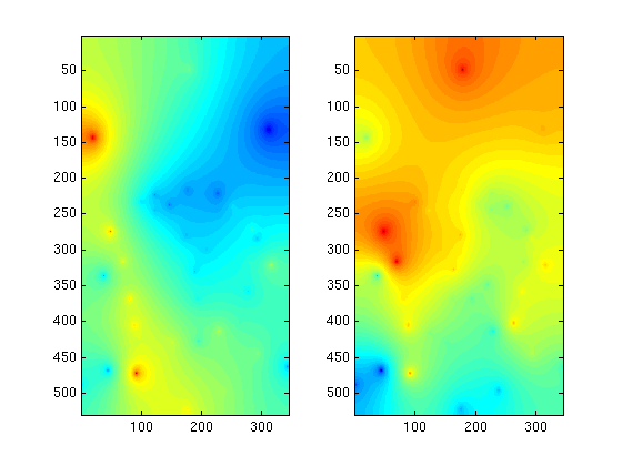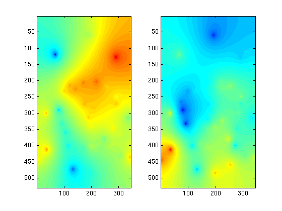 The algorithm to morph one face into the other creates a vector from one corresponding point to its partner in the other image. Then blend points are interpolated along that vector from beginning to end. Those points are known in the final image. The x and y cooridantes of every other point is interpolated separatley with poisson blending: